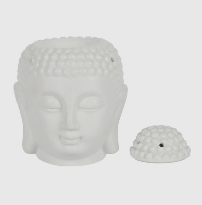 Een mat witte Buddha head brander, kan zowel met geuroliën als met waxmelts gebruikt worden.